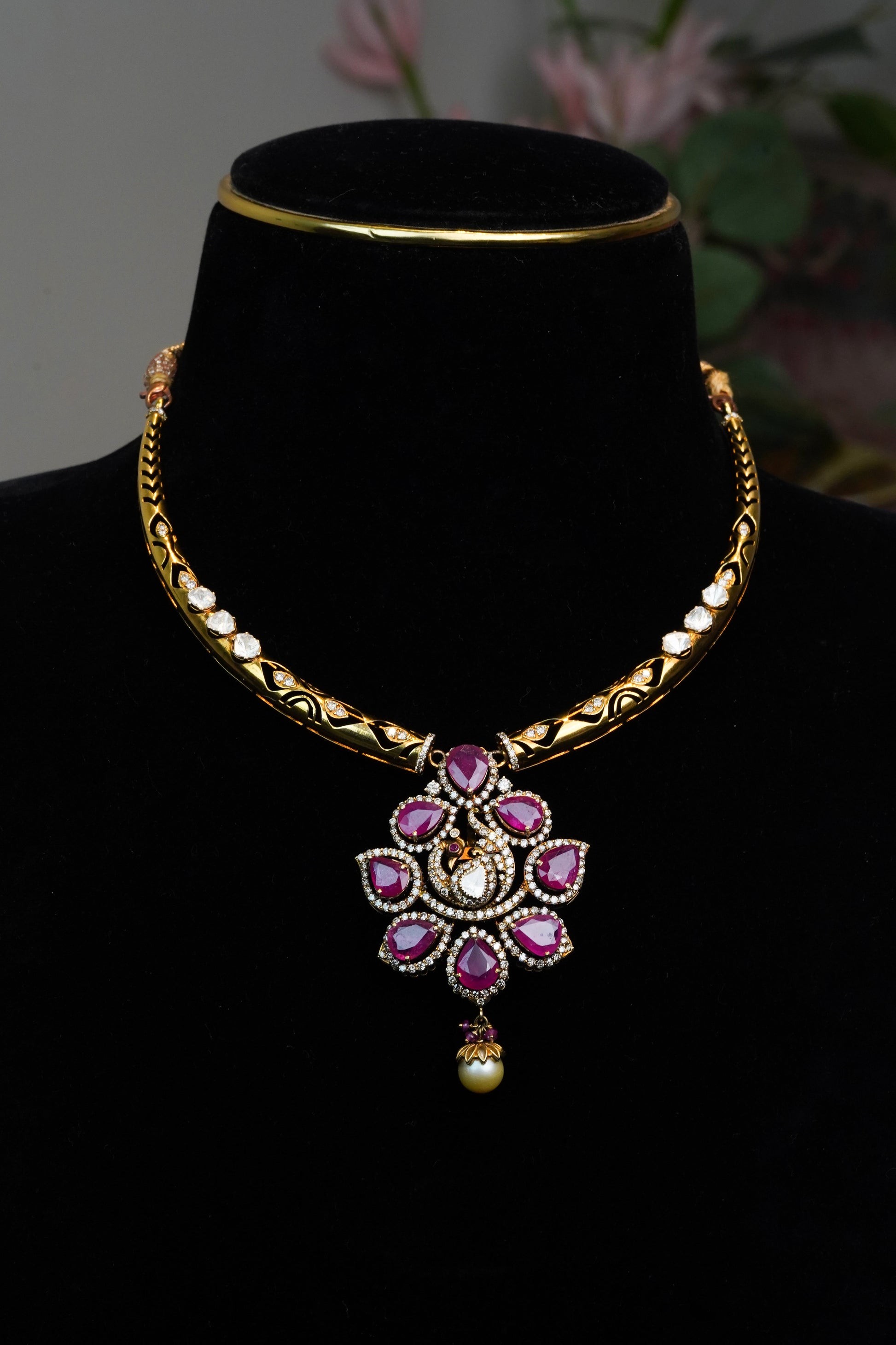 The deep crimson ruby symbolizes passion, strength, and prosperity, while luminous pearls represent purity and serenity. Together, they form a harmonious imperial bloom of rich color and soft elegance, making this necklace perfect for weddings, festive celebrations, and elegant evening occasions.