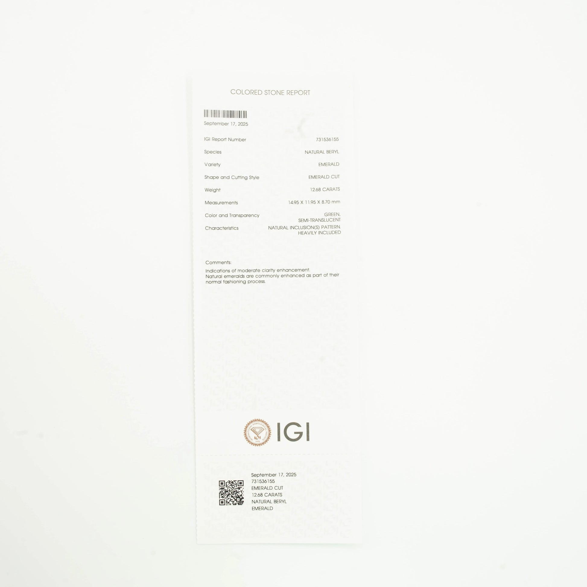 This magnificent Natural Emerald (Panna) weighing 12.68 carats radiates a deep green hue that reflects balance, prosperity, and wisdom. The gem’s natural inclusions highlight its authenticity, while its fine polish enhances the overall brilliance and charm.