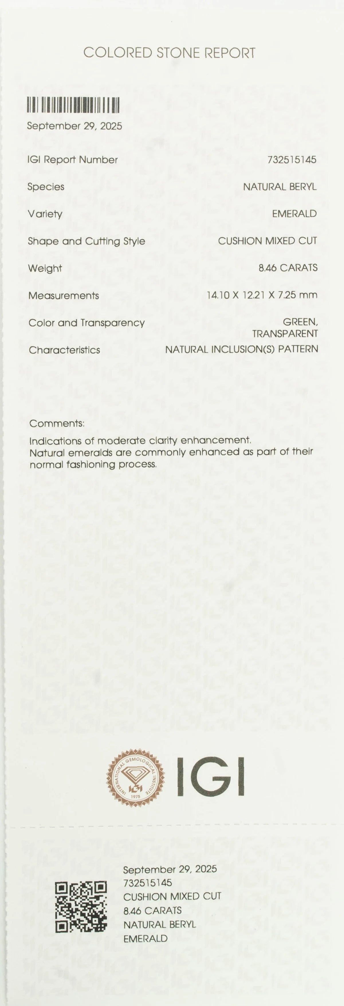 This beautiful Natural Emerald (Panna) weighing 8.46 carats features a graceful Cushion Mixed Cut, enhancing its deep green color and natural brilliance. The gemstone’s refined polish and balanced proportions bring out its inner radiance, while visible natural inclusions affirm its authenticity and natural origin.