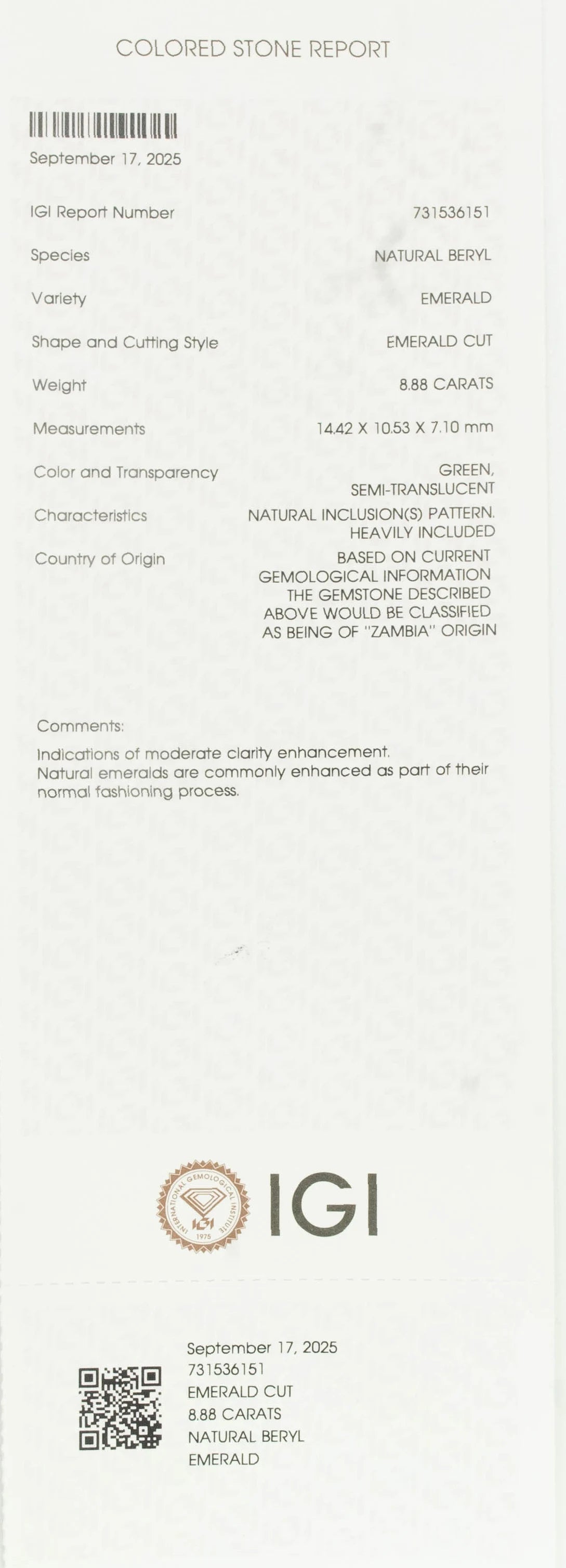This magnificent Natural Emerald (Panna) weighing 8.88 carats radiates a captivating green hue symbolizing harmony, prosperity, and timeless beauty. Masterfully emerald-cut, it reveals the gem’s natural inclusions and inner glow—hallmarks of authenticity and nature’s craftsmanship.