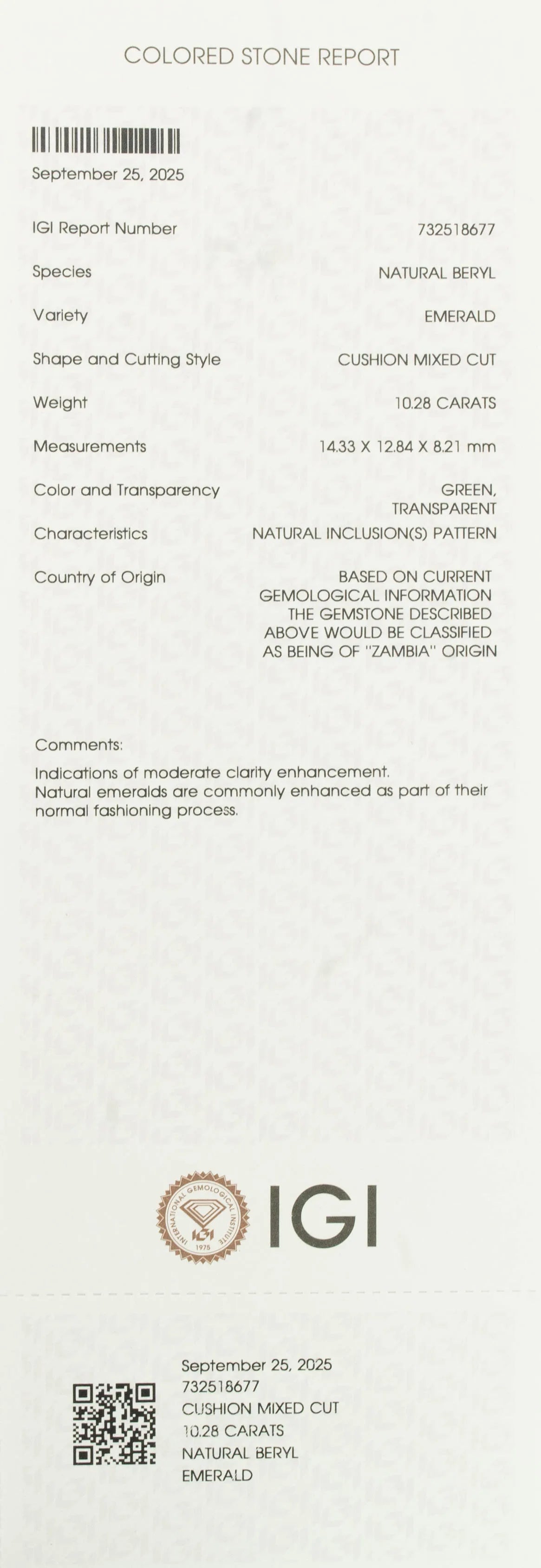 This exquisite Natural Emerald (Panna) weighing 10.28 carats displays a captivating Cushion Mixed Cut that enhances its rich green color and elegant brilliance. The gem’s fine polish and expertly crafted facets reflect exceptional luminosity, while its natural inclusions serve as a hallmark of authenticity and natural origin.
