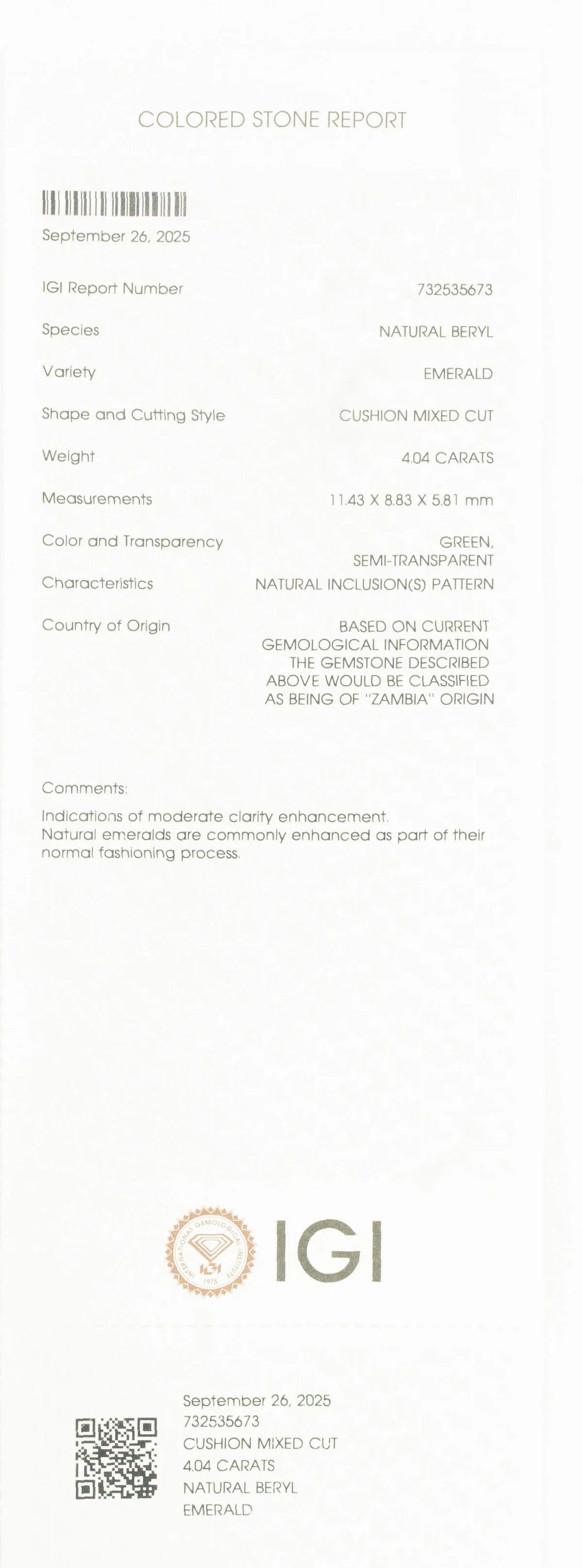 Country of Origin: Based on current gemological information the gemstone described above would be classified as being of "zambia" origin.
