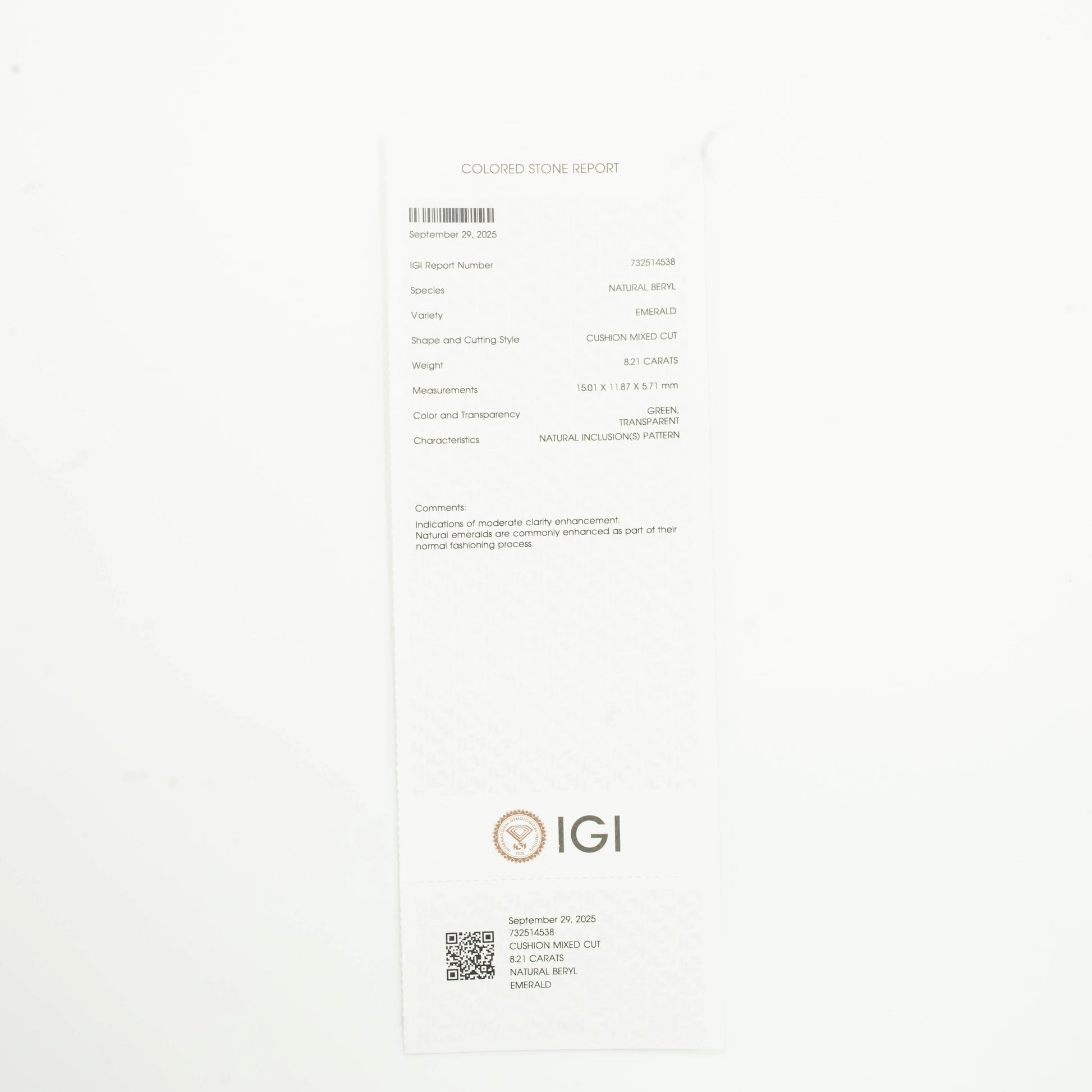 This beautiful Natural Emerald (Panna) weighing 8.21 carats displays a vibrant green color that represents prosperity, intelligence, and harmony. Its natural inclusions showcase its authenticity, while the gem’s fine polish adds brilliance and depth, making it an elegant choice for both astrological and ornamental purposes.