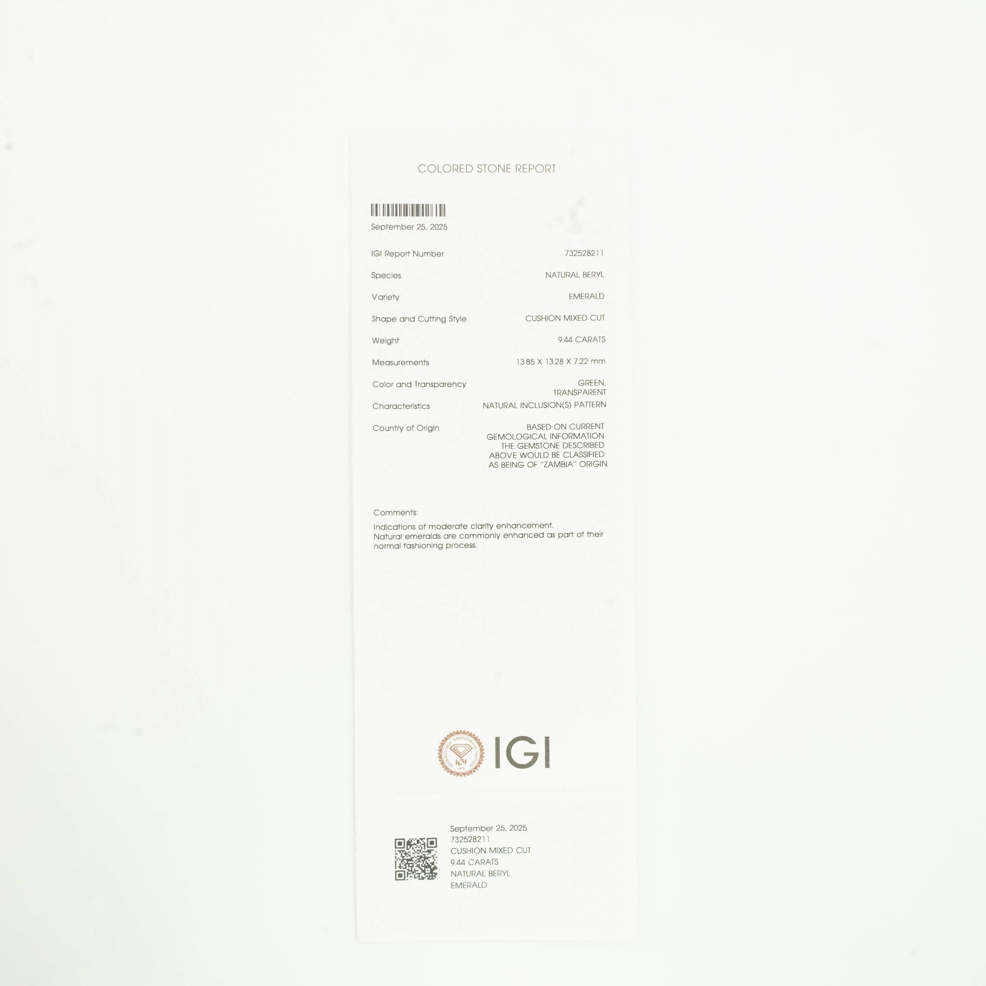 This captivating Natural Emerald (Panna) weighing 9.44 carats features a refined cushion mixed cut, enhancing its brilliance and depth. The gem exhibits a lush green hue that symbolizes prosperity, growth, and wisdom. Its natural inclusions serve as a hallmark of authenticity, while its fine polish and symmetry add a touch of sophistication — making it an excellent choice for both astrological benefits and fine jewelry.