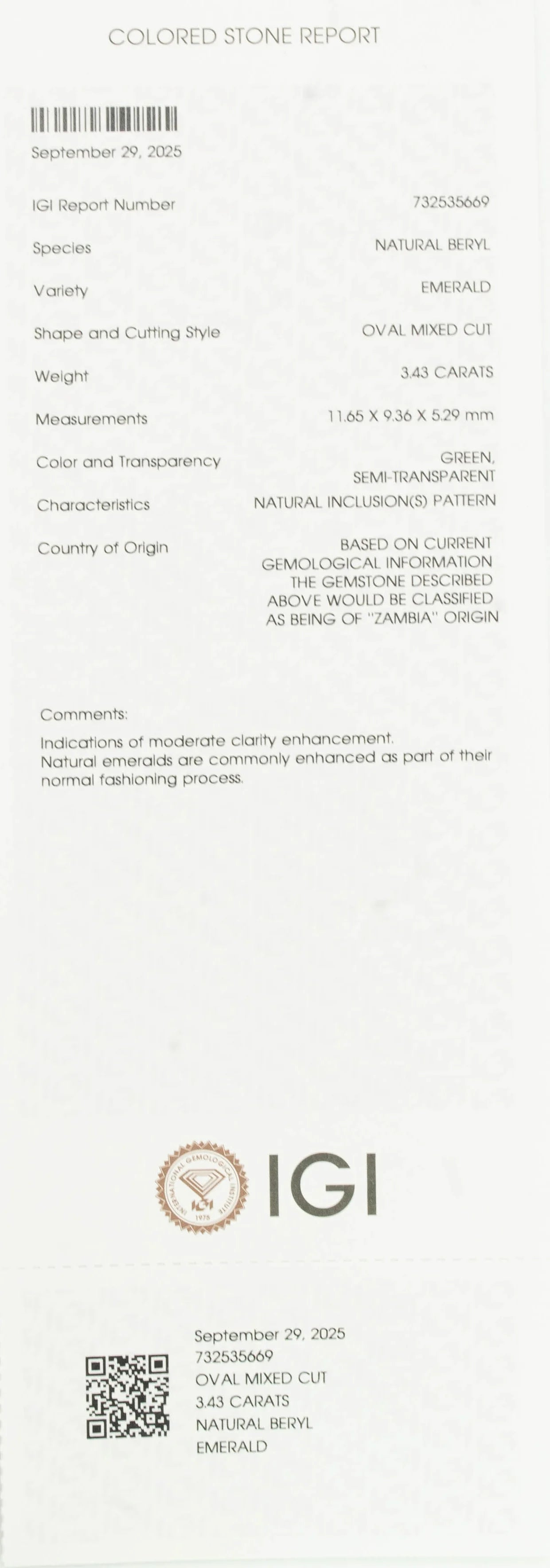 This charming Natural Emerald (Panna) weighing 3.43 carats exudes a lively green hue symbolizing growth, wisdom, and prosperity. Its natural radiance and fine polish give it a captivating appeal, while the visible inclusions highlight its authenticity and natural origin.