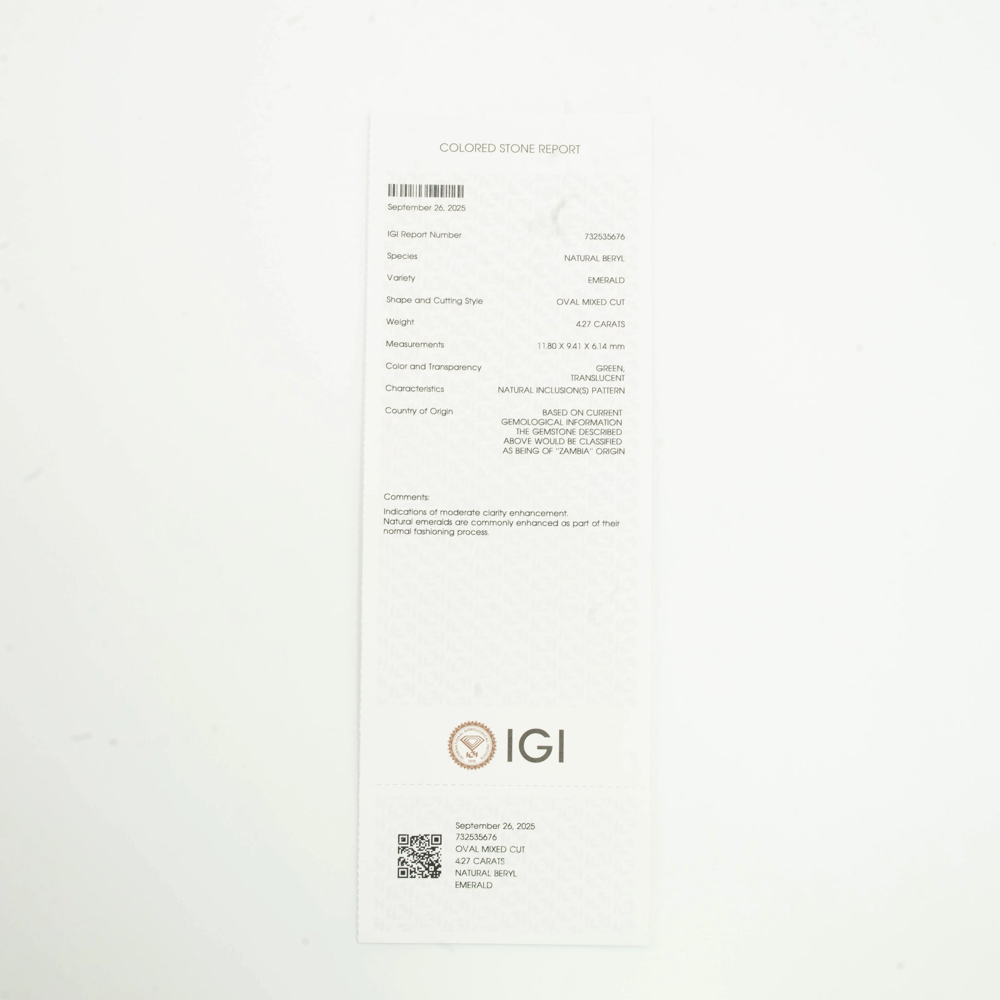 This elegant Natural Emerald (Panna) weighing 4.27 carats features a beautifully crafted oval mixed cut that enhances its brilliance and natural allure. The gemstone exhibits a vivid green hue, symbolizing prosperity, wisdom, and growth. Its natural inclusions signify authenticity, while the fine polish adds a radiant touch, making it an excellent choice for both astrological and ornamental purposes.