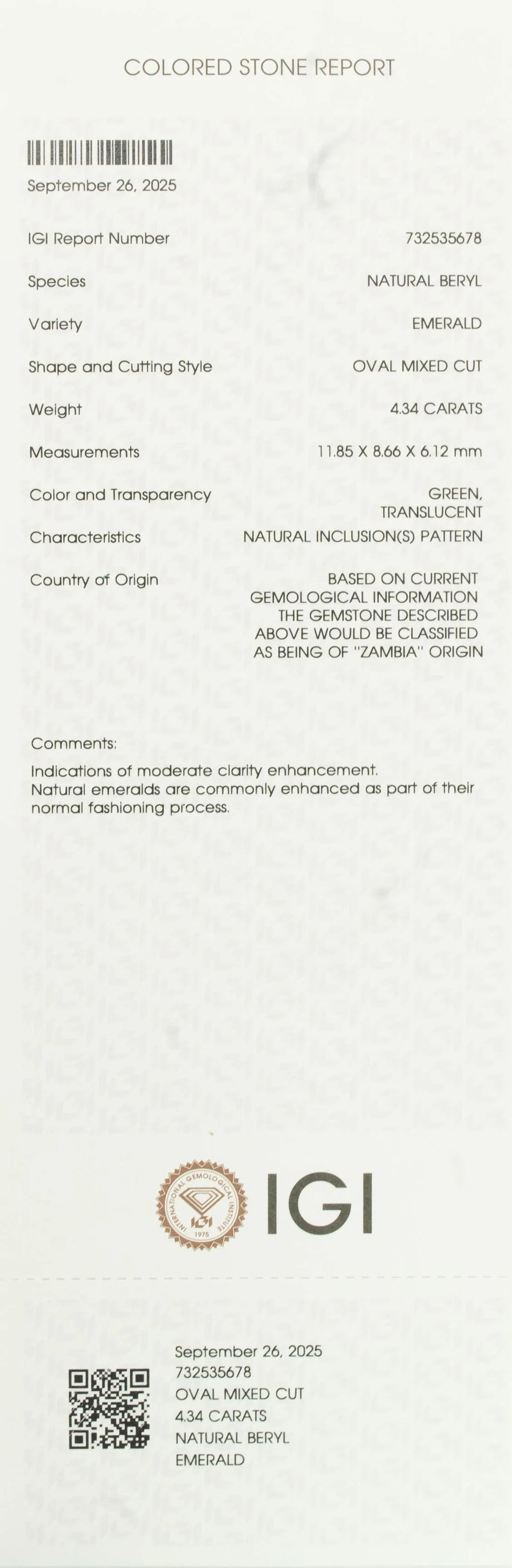 This radiant Natural Emerald (Panna) weighing 4.34 carats exudes a captivating green hue symbolizing growth, balance, and prosperity. Its natural brilliance and fine polish highlight the gem’s superior quality, while subtle inclusions within affirm its authenticity and natural origin.