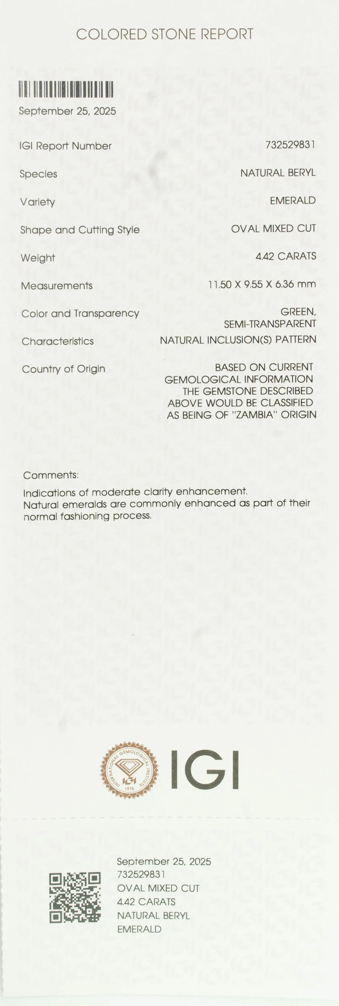 Elegant and naturally vibrant, this Natural Emerald (Panna) weighing 4.42 carats captivates with its lush green color and exquisite clarity. Expertly oval mixed cut, it highlights the gem’s inner radiance while preserving its natural inclusions—an unmistakable mark of authenticity.