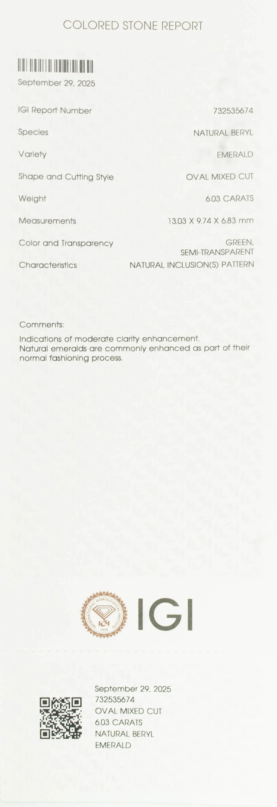 This stunning Natural Emerald (Panna) weighing 6.03 carats radiates a captivating green hue symbolizing wisdom, prosperity, and renewal. Expertly Oval Mixed Cut, it showcases excellent proportions and natural inclusions that highlight its authenticity and natural origin.