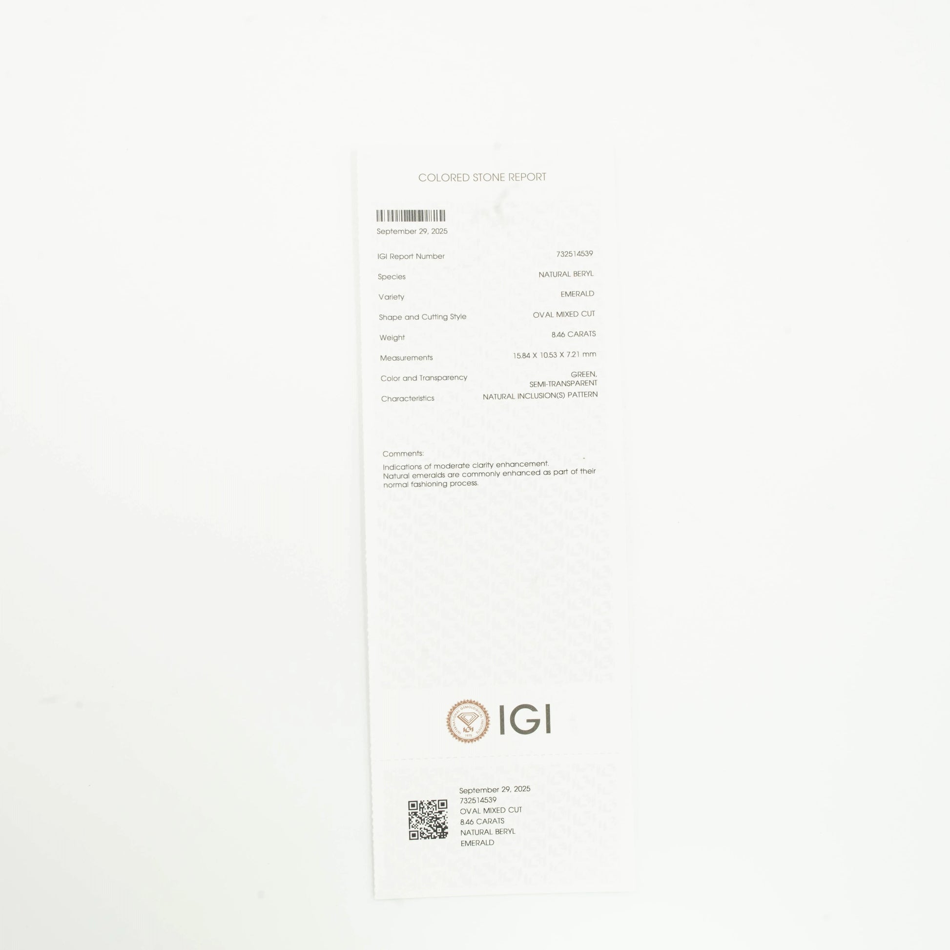 This elegant Natural Emerald (Panna) weighing 8.46 carats features a refined oval mixed cut that enhances its brilliance and symmetry. The gemstone exhibits a rich green hue, symbolizing prosperity, intelligence, and emotional balance. Its natural inclusions highlight its authenticity, while the superior polish adds to its captivating beauty — making it a perfect choice for astrological use or fine jewelry.