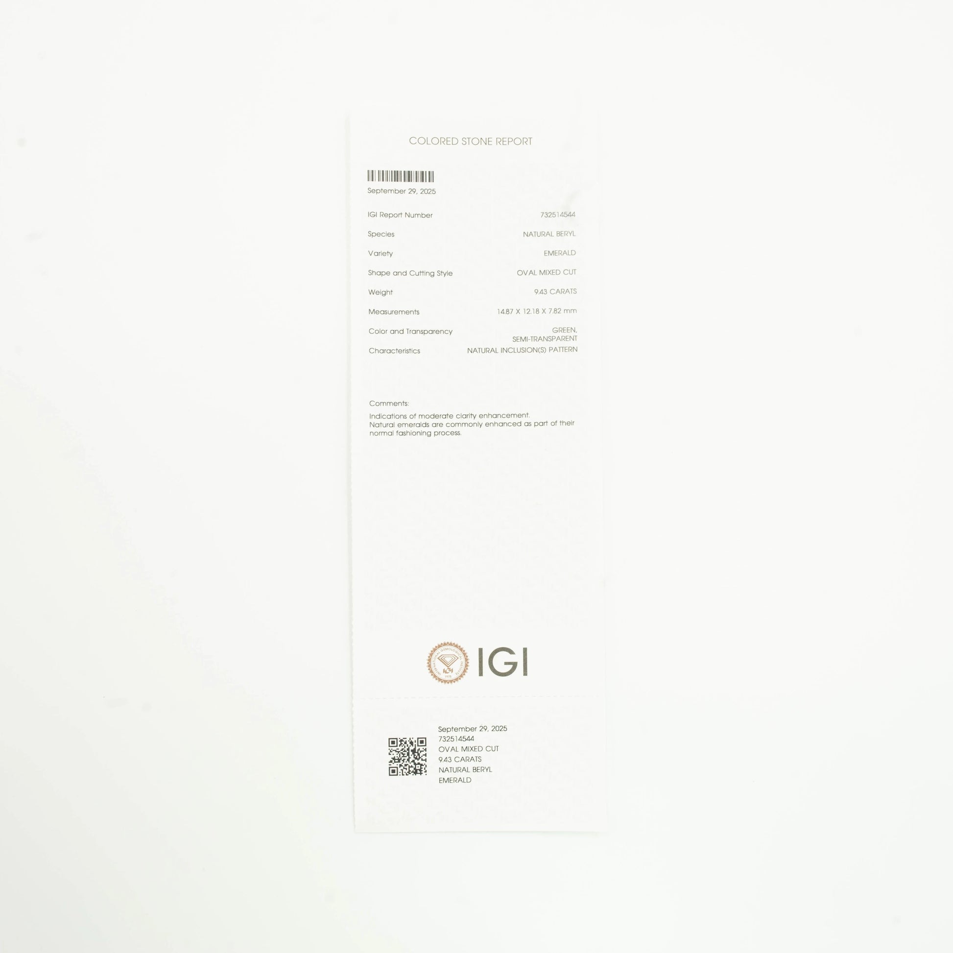 This exquisite Natural Emerald (Panna) weighing 9.43 carats features a beautifully balanced oval mixed cut that highlights its natural brilliance and vivid green hue. Symbolizing prosperity, intellect, and renewal, this gemstone reflects both elegance and spiritual depth. Its natural inclusions affirm authenticity, while the fine polish adds a refined luster, making it a perfect choice for astrological or ornamental use.