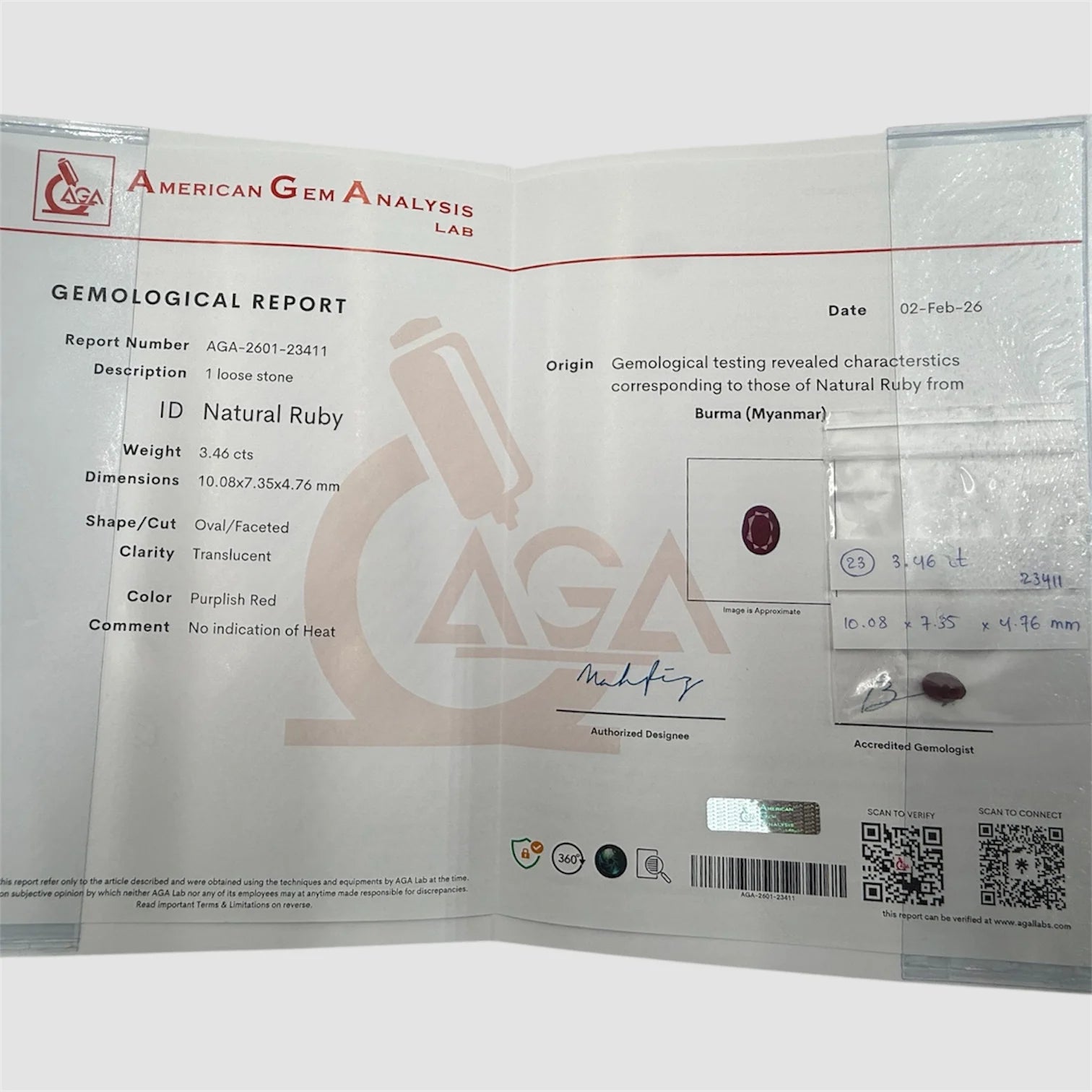This elegant Natural Ruby (Manik) weighing 3.46 carats is beautifully crafted in a classic oval faceted cut, designed to enhance brilliance and highlight the gemstone’s rich natural beauty. The precisely aligned facets reflect light gracefully, showcasing its deep and vibrant red hue—symbolizing power, passion, and prosperity. Natural inclusions within the gemstone confirm its authenticity, while the superior polish provides a smooth, radiant, and refined finish, making it an excellent choice for both astrological purposes and sophisticated jewelry creations.