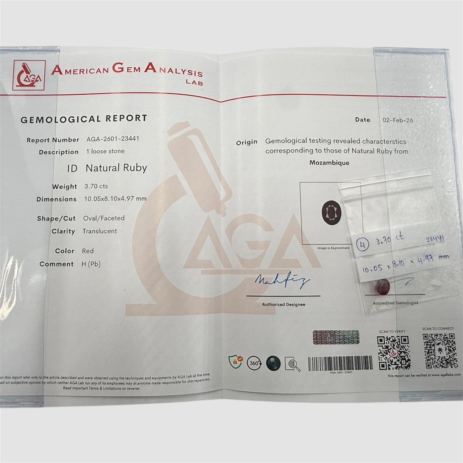 This elegant Natural Ruby (Manik) weighing 3.70 carats is beautifully crafted in a classic oval faceted cut, designed to enhance brilliance and highlight the gemstone’s rich natural character. The precisely aligned facets reflect light gracefully, showcasing its deep and vibrant red hue—symbolizing power, passion, and prosperity. Natural inclusions within the gemstone confirm its authenticity, while the superior polish provides a smooth, radiant, and refined finish, making it an excellent choice for both astrological purposes and fine jewelry creations.