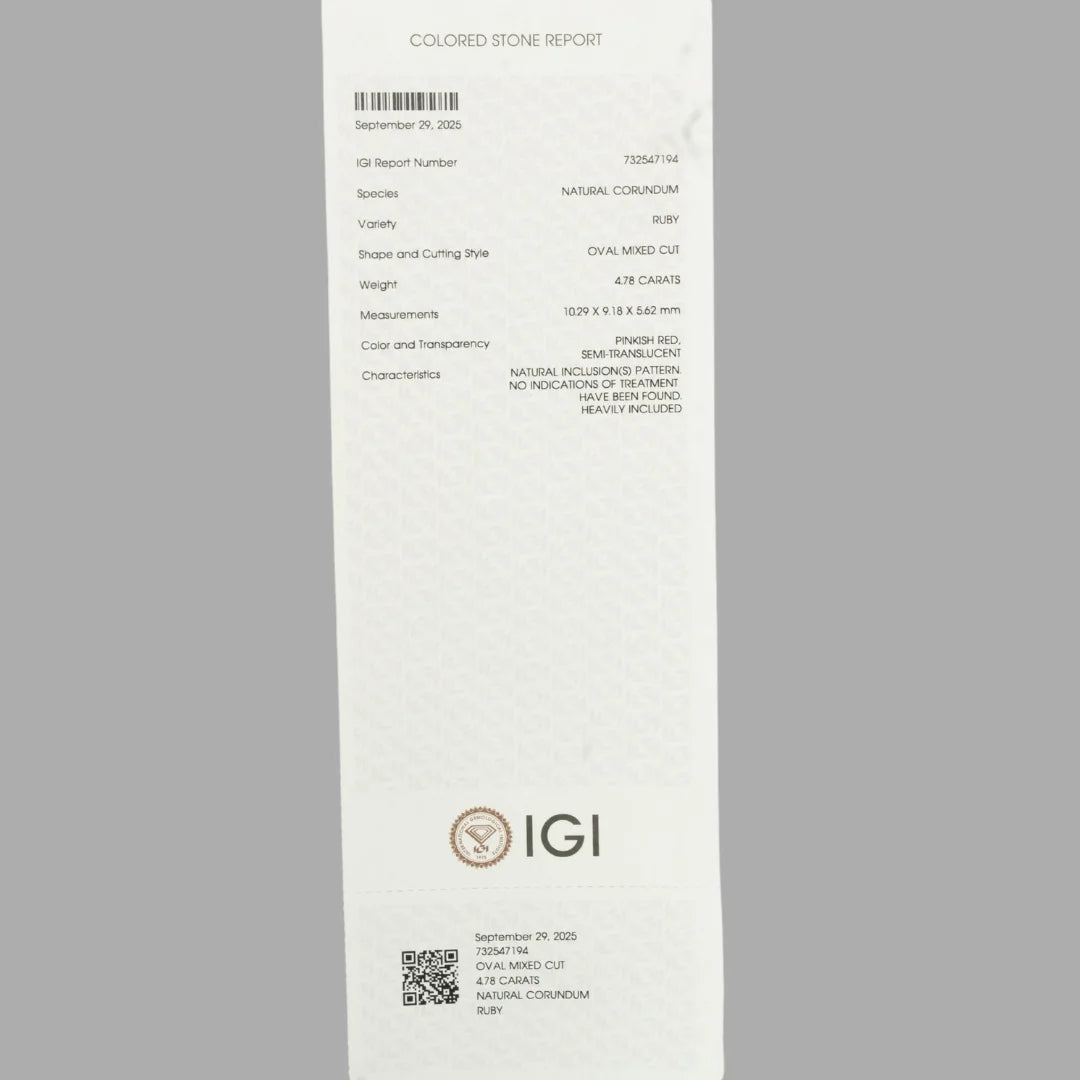 This captivating Natural Ruby weighing 4.78 carats radiates a rich, intense red hue that symbolizes power, vitality, passion, and confidence. Expertly crafted in an oval mixed cut, the gemstone displays impressive brilliance, smooth symmetry, and a refined glow that highlights its natural beauty and uniqueness. Its vibrant colour and clarity make it an exceptional choice for both astrological benefits and high-quality jewellery.