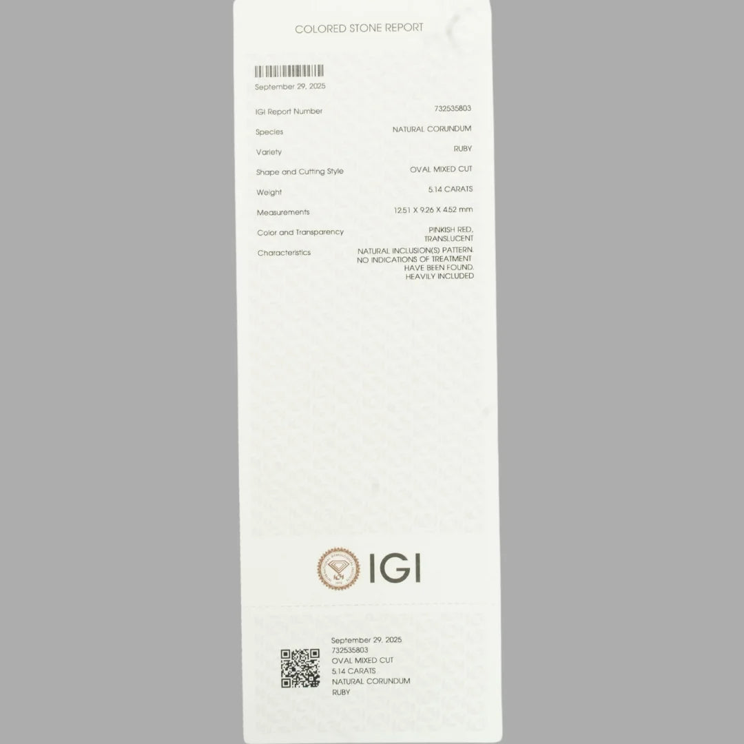 This beautiful Natural Ruby weighing 5.14 carats shines with a rich, glowing red hue—representing courage, vitality, passion, and royal energy. Cut in an elegant oval mixed cut, the gemstone displays excellent brilliance and symmetry, allowing light to dance across its facets while enhancing its natural depth and color. Its refined appearance and purity make it an excellent choice for both astrological benefits and fine jewellery.