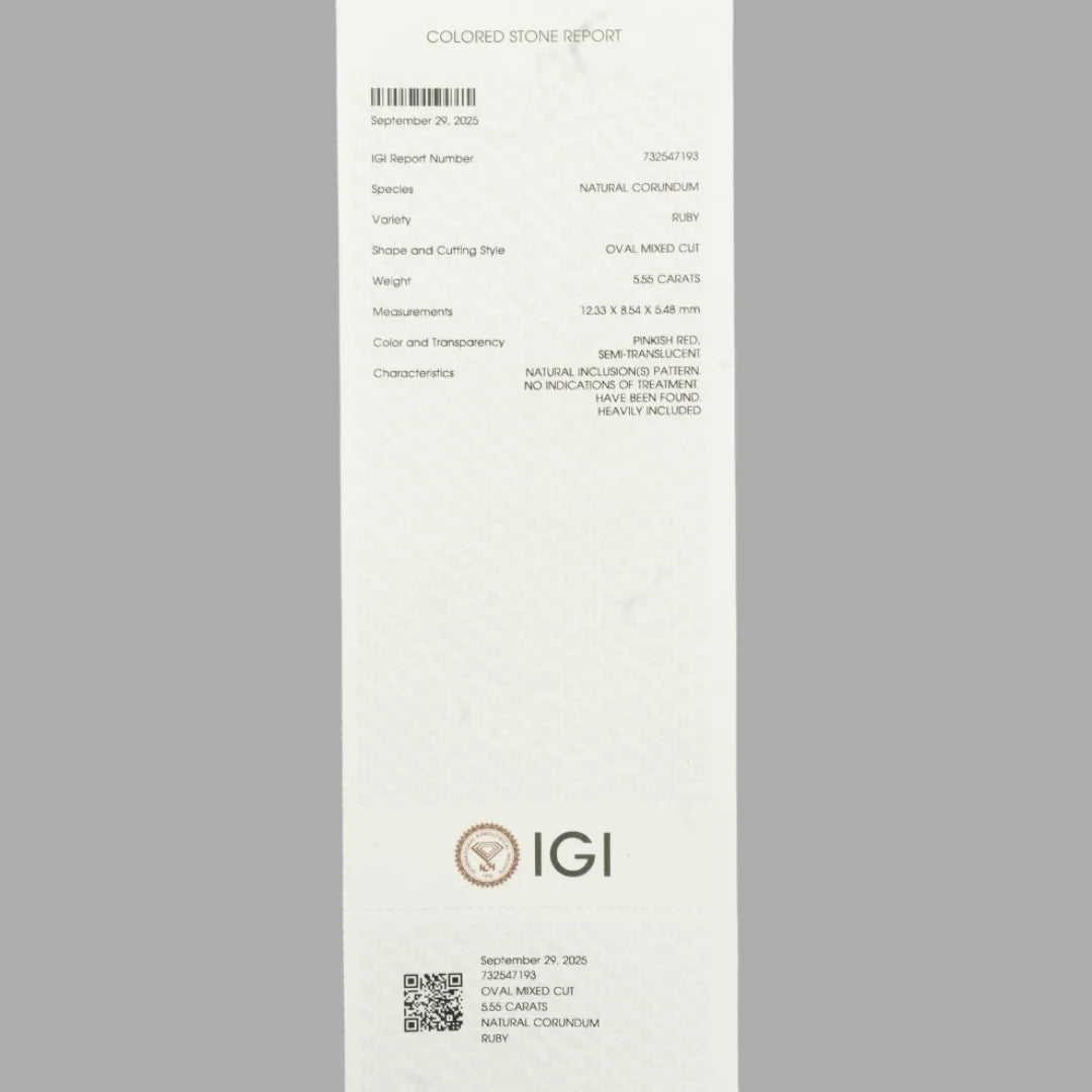 This exquisite Natural Ruby (Manik) weighing 5.55 carats features a finely polished oval mixed cut, masterfully enhancing its deep red color, radiant sparkle, and overall visual allure. Its balanced proportions make it a perfect choice for luxury jewelry pieces, while its natural vibrance supports strong astrological benefits.