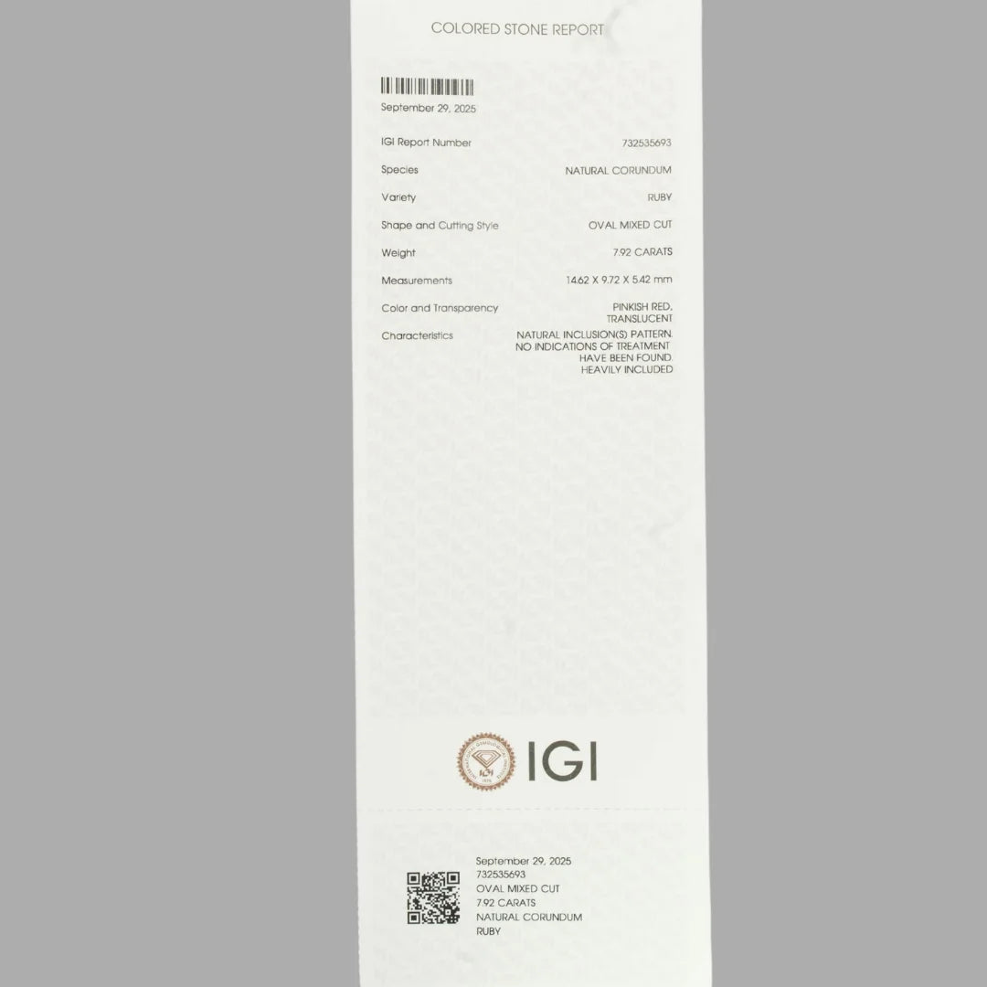 This striking Natural Ruby (Manik) weighing 7.92 carats features a brilliantly crafted oval mixed cut, enhancing its deep red color, inner fire, and captivating brilliance. With its impressive size and rich saturation, this gemstone stands out as a luxurious choice for statement jewelry as well as a potent stone for astrological empowerment.