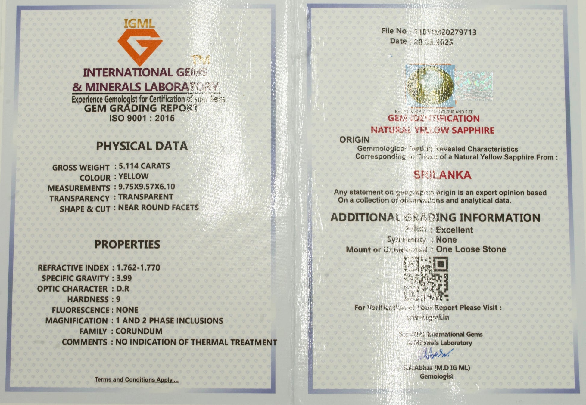 This brilliant Natural Yellow Sapphire (Pukhraj) weighing 5.11 carats features a finely cut round shape that enhances its luster and brilliance. The gemstone radiates a warm golden-yellow hue, symbolizing prosperity, wisdom, and divine grace. Its natural clarity and vibrant color make it an excellent choice for both astrological and ornamental purposes.